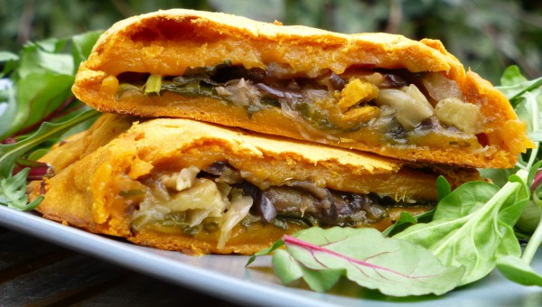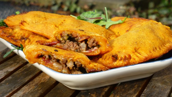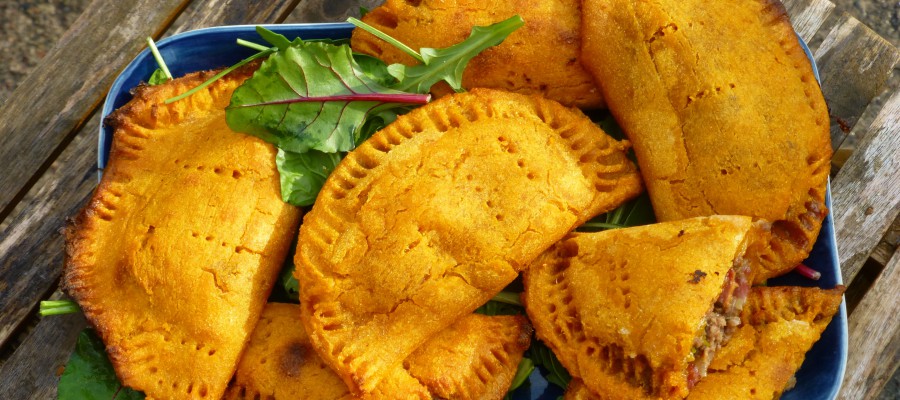 AIP. Saftiga solgula piroger där degen är gjord av kokt sötpotatis och cassavamjöl. Olika sorters cassavamjöl kräver olika mängd, så knåda in lite mer mjöl om degen är för lös. Fyll med valfri fyllning t ex köttfärs, bacon, svamp eller gör dem helt vegetariska.