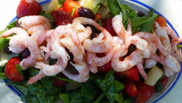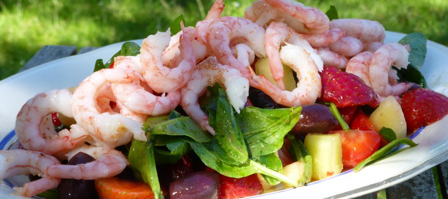 PALEO/AIP. Somrig sallad med jordgubbar, melon, kalamataoliver och stora färska räkor.