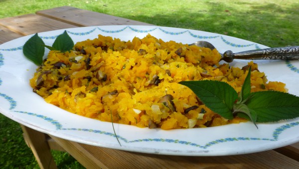 Skala och riv pumpan grovt på ett rivjärn eller pulsa till ris i en matberedare.