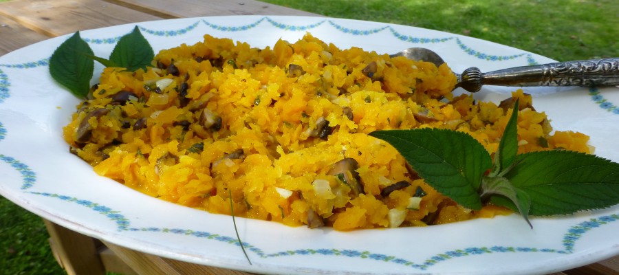 1 st Butternutpumpa ,ca 500 gram skalad 1 msk Olivolja 1 st Gul lök, finhackad 1-2 st Vitlöksklyftor, finhackade 2-3 dl Svamp, t ex kantareller eller champinjoner, shiitake 1/2 dl färsk salvia eller 1 msk torkad - eller persilja 2 dl Buljong, t ex kyckling- eller benbuljong. Det går även bra med vatten. 1 tsk Äppelcidervinäger Salt & Peppar Efter smak Gör så här: