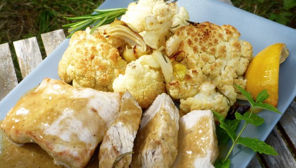 AIP/PALEO. Kött, sås och ugnsrostad blomkål med vitlök, lök och citron. En riktig söndagsmiddag. På bilden syns kalkonfilé.