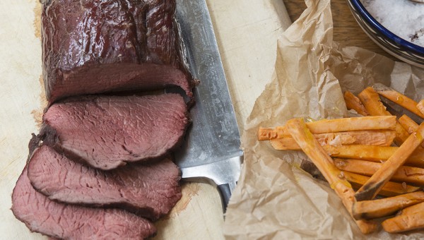 1 kg Rostbiff av nöt Lite Havssalt Lite Olivolja Till servering Förslag: Varsin portion Notatissallad Krispiga Sötpotatisstrips Gör så här: