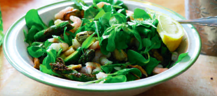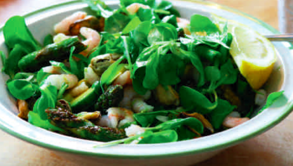 Koka sparrisen i 5 minuter i saltat vatten och skär dem sedan i bitar och lägg i salladen. Pressa färsk citron över.