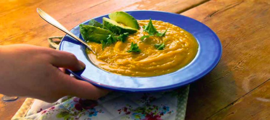 1 st butternut squash-pumpa, delad och rensad från kärno 1 st Gul lök, finhackad 2 st Vitlöksklyftor, finhackade 5 dl Buljong, helst benbuljong 1 dl Färska kryddor, tex basilika eller koriander 1 tsk Havssalt 2 msk Olivolja eller kokosolja Gör så här: