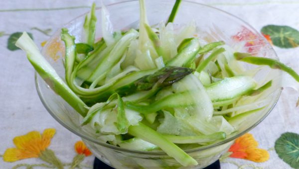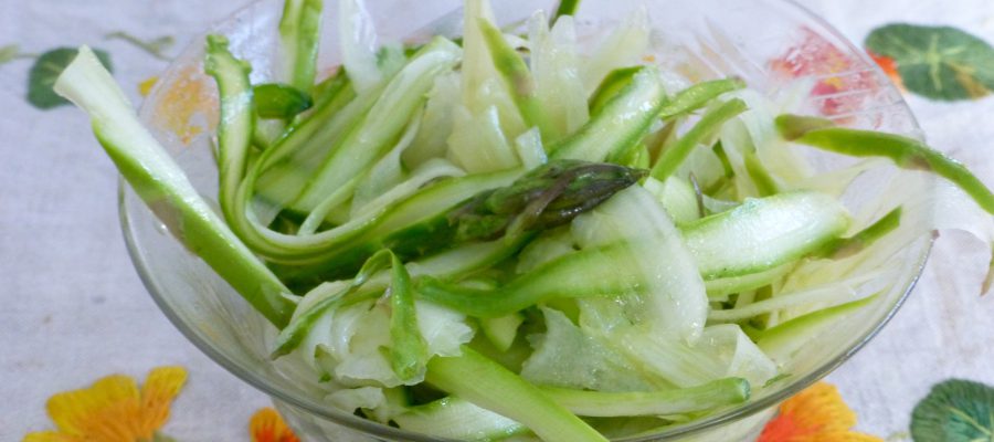 AIP/PALEO. Fräsch, krispig sallad med bara två ingredienser – hyvlad färsk sparris och fänkål. Dressing på olivolja och citron.