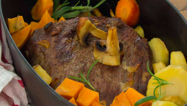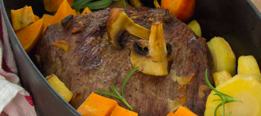 1 st Nötköttstek på 1–2 kg 2 st Gula lökar 2 st Morötter 10 st Champinjoner, hela 1 tsk Salt per kilo kött 1 dl Färska kryddor - t ex timjan, dragon eller persilja Gör så här: