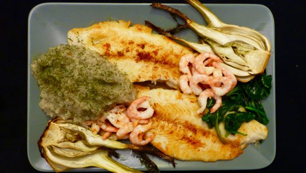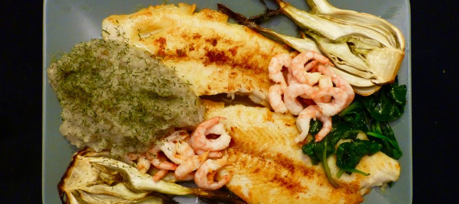 AIP/PALEO. Stekt vitfisk med gurkmeja som serveras med mos på jordärtsskocka och med ugnsbakad fänkål och toppas med en hög av skalade räkor.