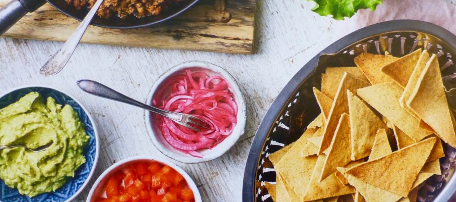 PALEO. Klassisk taco-middag med nachochips. Ladda bordet med klassiska tillbehör som köttfärs med egna tacokryddor, guacamole, salsa, hackad lök, picklade grönsaker och sallad. Recept från Annika Sjöö.