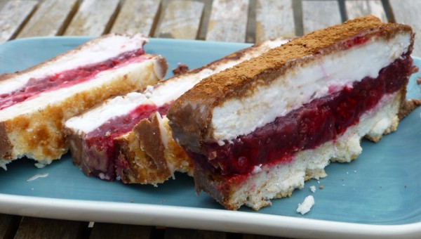 Nu är kakan ute ur ugnen och den har svalnat. Bred på syltlagret: Lägg ett lager med bär, t ex hallon på det första lagret i formen. Därefter 2 dl sylt. Bred ut och tryck ner så det blir jämnt fördelat. Snabbsylt: mosa en halv banan med 2 dl bär och en tsk honung.