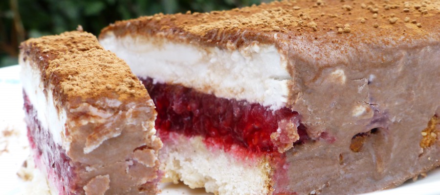 AIP. En egen variant på den amerikanska kakan ”Wagon Wheel cake”. Botten är gjord på en kokosdeg, mellanskiktet innehåller bär och jordgubbssylt (AIP) samt översta lagret med pannacotta. Hela tårtan är klädd i ”chokladsås” som vi gjort på carob istället för kakao. Äter man vanlig paleo går det utmärkt att ha ren kakao i chokladsåsen.