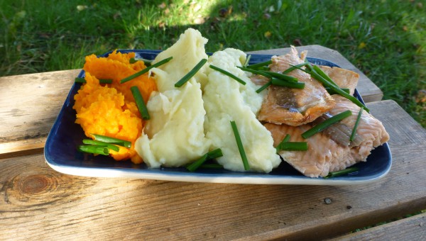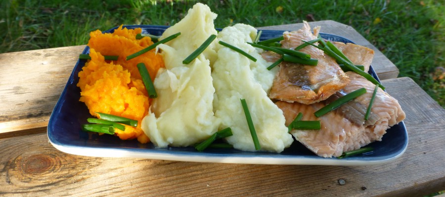 400 g Fisk, färsk av valfri sort 1 knippe Gräslök till garnering 1 st Citron, till servering Palsternacksmoset Ingredienser: 5-7 st Palsternackor 2 msk Kokosolja 1-2 tsk Potatismjöl/arrowrot Salt Efter smak Morotsmoset Ingredienser: 5-7 st Morötter, mellanstora 1 st Vitlöksklyfta 1 msk Citronjuice 2 msk Kokosolja 1-2 tsk Potatismjöl/arrowrot Salt Efter smak Jordärtskocksmoset Ingredienser: 10-15 st Jordärtskockor 2 msk Kokosolja 1-2 tsk Potatismjöl/arrowrot Salt Efter smak Gör så här: