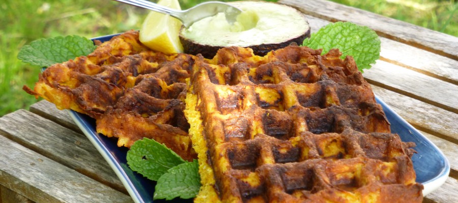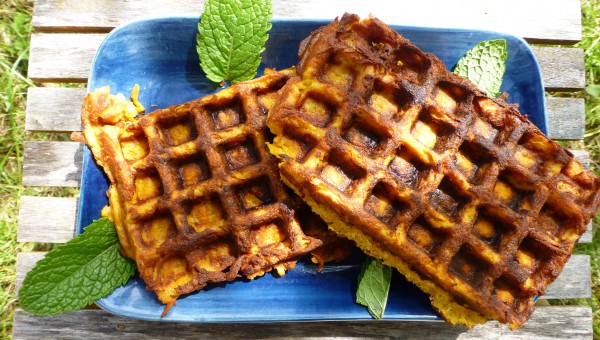 Låt smeten dra några minuter. Grädda 1-2 våfflor beroende på järn. Låt dem gå längre än vanliga våfflor så att sötpotatisen hinner tillagas.