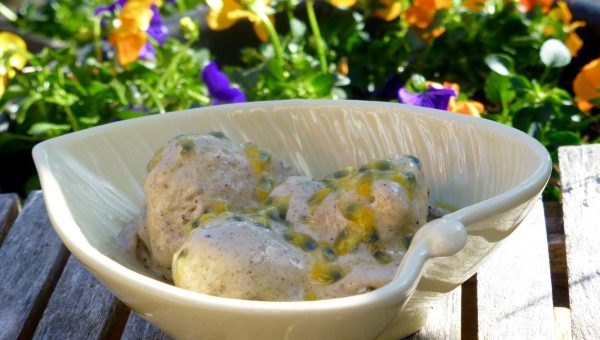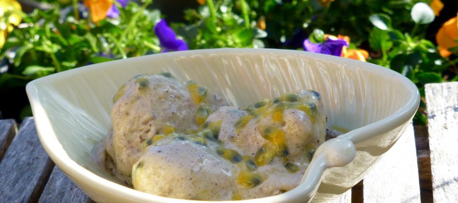 1 Äggula 1 dl Kokosmjölk eller kokosgrädde 1 tsk Äkta vaniljpulver 2 st Frysta och delade bananer 1-2 Passionsfrukter till servering Gör så här: