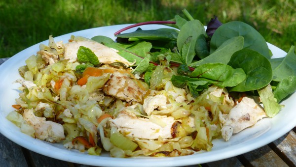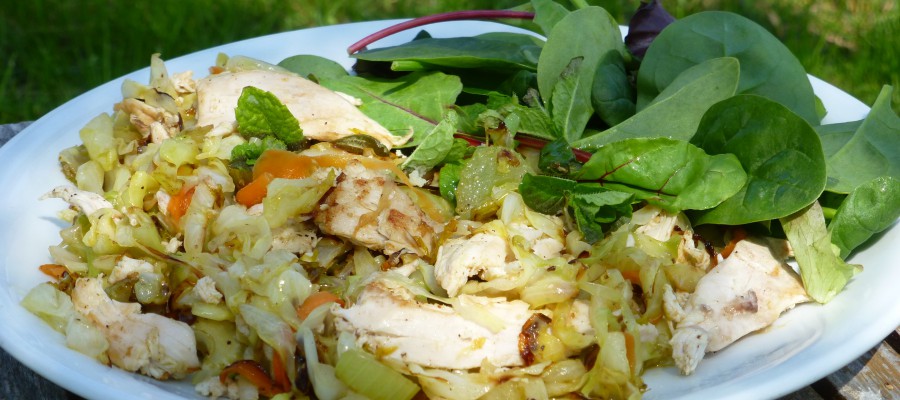 PALEO/AIP. Strimlad vitkål och morot som steks mjuk i kokosolja tillsammans med kycklingstrimlor är en enkel och god rätt som går snabbt att svänga ihop. Att tillsätta äppelcidervinäger i slutet ger en mustig smak.