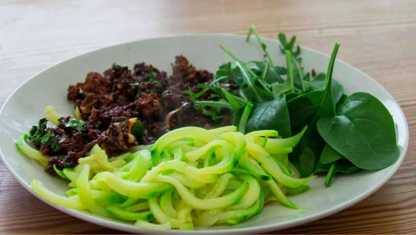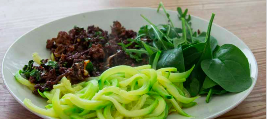 Köttfärssås Ingredienser: 500 g Nötfärs 2 st Kokta och mosade rödbetor 1 dl Champinjoner, tärnade 2 st Gula lökar 2 st Vitlöksklyftor, finhackade 1 st Riven morot 1/2 dl Kokosmjölk 1 tsk arrrowrot Lite färsk persilja att klippa över 1 msk Kokosolja att steka i Zoodles Ingredienser: 1 st Zucchini, stor, eller två mindre 1 nypa Havssalt Gör så här: