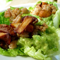 Salladsbåtar med kantarell, guacamole och stekt kycklingfärs AIP